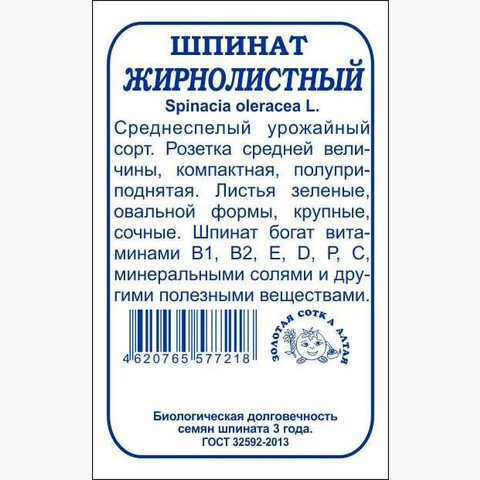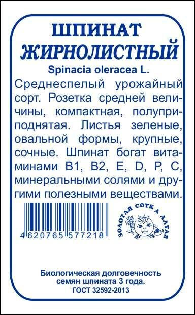 Сорт среднеспелый, урожайный. Розетка средней величины, компактная, полуприподнятая. Листья зеленые, овальной формы, крупные, сочные, приятного вкуса. Шпинат содержит комплекс витаминов и минералов, фолиевую и щавелевую кислоты, клетчатку, антиоксиданты; богат белком, легкоусваиваемым железом, рекордсмен по содержанию йода. Используется при приготовлении салатов, гарниров, супов и омлетов, подходит для замораживания.
