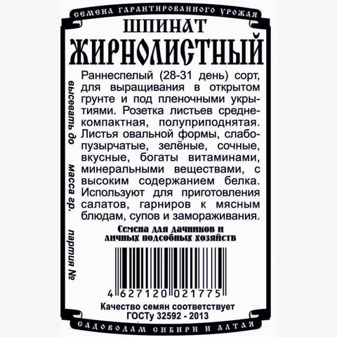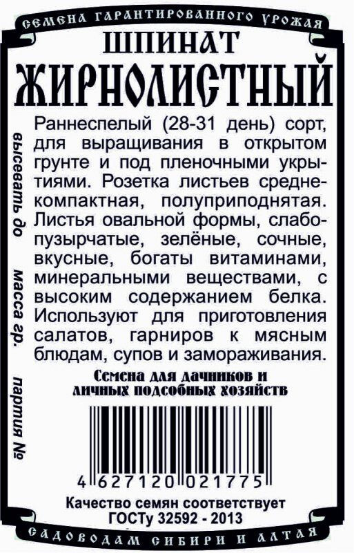 Раннеспелый (28-31 день) сорт, для выращивания в открытом грунте и под пленочными укрытиями. Розетка листьев среднекомпактная, полуприподнятая. Листья овальной формы, слабопузырчатые, зелёные, сочные, вкусные, богаты витаминами и минеральными веществами, в нем высокое содержание белка. Используют для приготовления салатов, гарниров к мясным блюдам, супов и замораживания