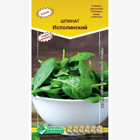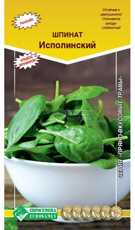 Шпинат - ценная по питательным качествам культура, богатая белком, солями железа, калия и кальция, витаминами. Исполинский - сорт раннеспелый, период от полных всходов до технической спелости составляет 30-40 дней. Розетка средне компактная, полу приподнятая. Листья зеленые, сочные, нежные. Используется в свежем виде. Холодостойкий сорт, отличается устойчивостью к заморозкам, требовательностью к влаге, хорошо отзывается на полив, к цветушности. Урожайность 2,5-2,8 кг/м2. Рекомендуется для потребления в свежем виде и для замораживания. Из него готовят всяческие супы, салаты, пудинги, котлеты, используется и шпинатный coк.