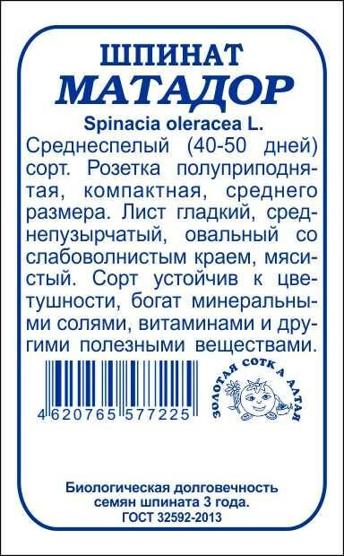 Сорт среднеспелый, устойчив к цветушности. От всходов до хозяйствен-ной годности 40-50 дней. Розетка компактная, полуприподнятая, среднего размера. Лист гладкий, мясистый, среднепузырчатый, овальный с волнистым краем. Шпинат содержит комплекс витаминов и минералов, фолиевую и щавелевую кислоты, клетчатку, антиоксиданты; богат белком, железом, йодом. Полезен для профилактики рахита. Рекомендуется для непосредственного потребления, переработки и заморозки.