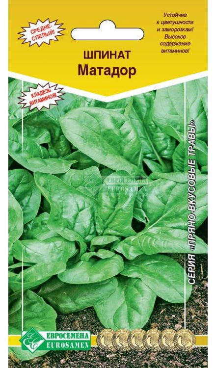 Шпинат - ценная по питательным качествам культура, богатая белком, солями железа, калия и кальция, витаминами, является однолетней культурой семейства Маревые. В составе шпината много витаминов и минералов, богат он клетчаткой. Количество воды в листьях растения составляет до 90 %. При температурной обработке качественный состав гораздо ухудшается. Поэтому рекомендуется принимать его в пищу в сыром виде в составе салатов, смузи и других блюд. Его вызревание длится не более месяца. Матадор- сорт среднеспелый, очень урожайный. Молодые побеги начинают убирать через 40-50 дней после всходов. Растение средне ветвистое, розетка компактная, среднего размера. Листья средне пузырчатые, тёмно-зелёные, глянцевые. Растение устойчиво к заморозкам, отзывчиво на полив. Сорт отличается устойчивостью к цветушности. Рекомендуется также для замораживания.