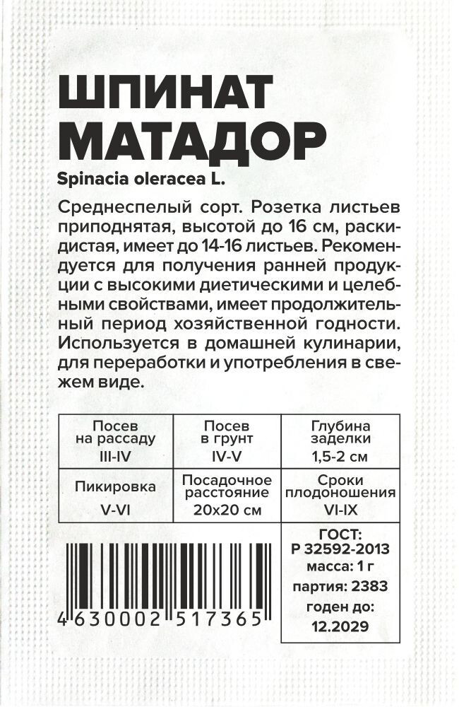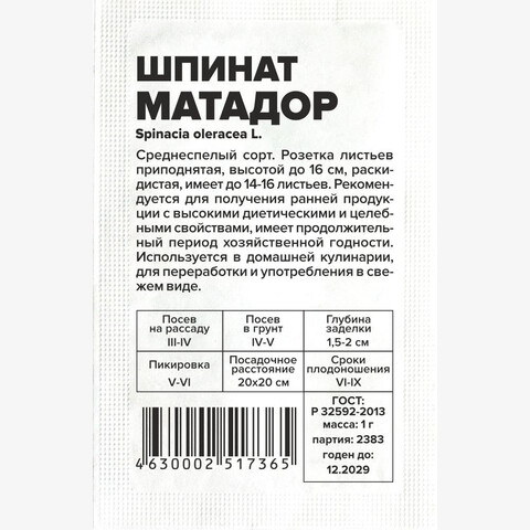Среднеспелый сорт. Розетка листьев приподнятая, высотой до 16 см, раскидистая, имеет до 14-16 листьев. Рекомендуется для получения ранней продукции с высокими диетическими и целебными свойствами, имеет продолжительный период хозяйственной годности. Используется в домашней кулинарии, для переработки и употребления в свежем виде. Место посадки: защищенные от ветра участки с плодородной хорошо дренированной почвой. Лучшие предшественники: огурцы, томаты, бобовые и кабачки Освещение: обильное, выносит затенение Предпосевная подготовка: не требуется, но для получения более ранних всходов можно замочить семена на 1 сутки в воде Сроки посева: в открытый грунт в апреле-августе Посев на рассаду: не предусмотрен Посев в грунт: после прогревания почвы до +10-12°С, можно высевать в несколько сроков с интервалом 2-3 недели для постоянного получения молодой зелени на участке. Готовят бороздки глубиной 1,5-2 см, оставляя междурядья 20-30 см, или сеют пучками. Грунт увлажняют, семена присыпают землей и слегка уплотняют субстрат, накрывают тонким укрывным материалом и очень обильно поливают теплой водой через укрывной материал (во избежание размывания почвы и семян). Всходы появляются в течение недели, они способны выдерживать кратковременные заморозки до -4-6°С. В фазе 2-4 листьев всходы прореживают на расстояние 20-25 см. Можно выращивать в качестве комнатного растения в контейнерной культуре Пикировка/перевалка: не предусмотрена Уход: заключается в поливе, подкормках, рыхлении посадок и своевременных прополках Сбор урожая: через 20-40 дней после посева, когда у растений уже сформируется розетка из пяти-шести листьев, а у некоторых даже появится небольшой стебель