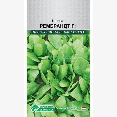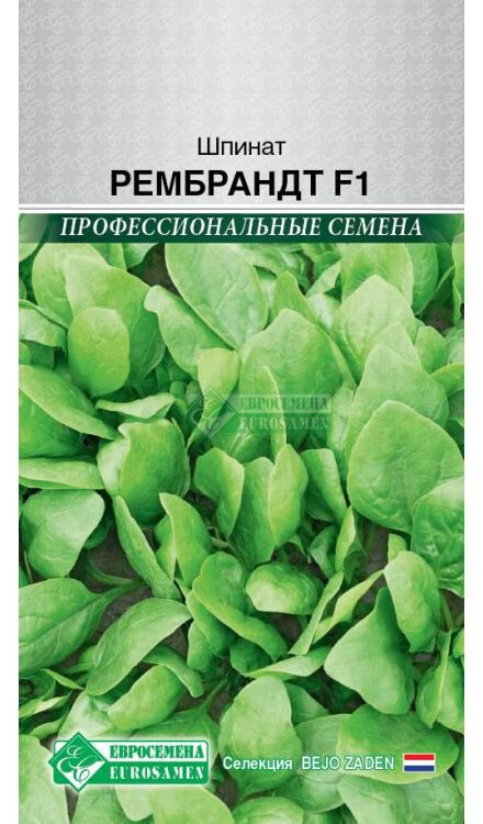 Шпинат — культура вкусная, быстрорастущая и целебная. Уход — минимальный, а урожай — максимально полезный. К тому же шпинат можно замораживать и хранить до следующего сезона. Шпинат содержит легкоусвояемые белки, углеводы, а также много калия, магния, железа, фосфора, йода, витамины А, В, С, В1 В2, В9, D, Р, Е, Н, РР, К и секретин, способствующий лучшему пищеварению. Регулярное потребление шпината способствует нормальной работе сердца. Рембрандт F1-среднеранний гибрид, период от всходов до технической спелости составляет 58 дней. Розетка листьев до 20 см. Лист зелёный, среднего размера, овальной формы, выгнутый, слабо пузырчатый, дольчатость слабая, черешок среднего размера до длинного, массой 40- 50 гр. Выращивается круглогодично в открытом и закрытом грунте. Рекомендуется использование в домашней кулинарии. Особым успехом у домашних пользуется суп-пюре из шпината и картофеля.