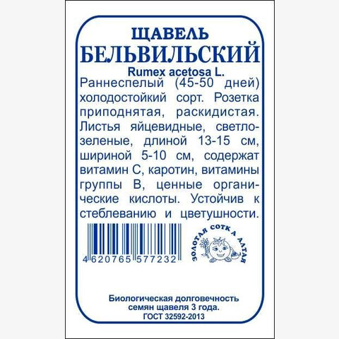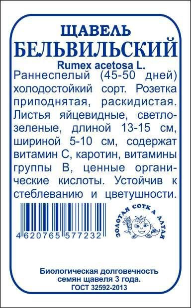 Ранний холодостойкий сорт, устойчивый к стеблеванию и цветушности. От отрастания листьев до хозяйственной годности 45-50 дней. Розетка приподнятая, раскидистая. Листья яйцевидной формы, светло-зеленые, длиной 13-15 см, шириной 5-10 см, приятного кисловатого вкуса. Щавель содержит витамины, микроэлементы и органические кислоты. Используется в свежем виде и в кулинарии, заготавливается впрок.