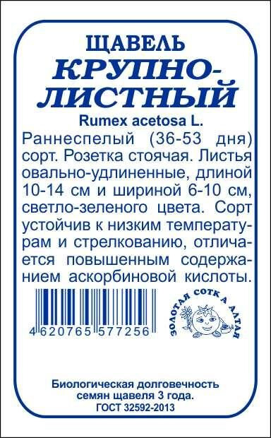 Сорт ранний, устойчив к стрелкованию и низким температурам. От всходов до хозяйственной годности 36-53 дня. Розетка стоячая. Листья светло-зеленые, овально-удлиненные, длиной 10-14 см и шириной6-10 см, с повышенным содержанием аскорбиновой кислоты. Щавель богат витаминами, минеральными солями и органическими кислотами. Используется в свежем виде, для приготовления зеленых щей, заготовок и начинок к пирогам.