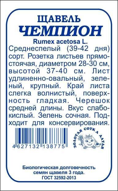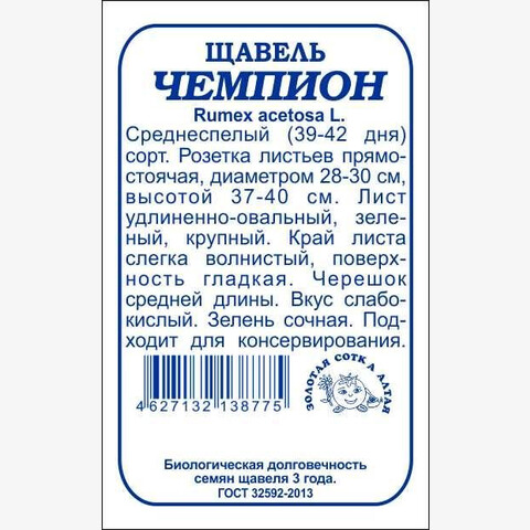 Среднеспелый (39-42 дня) сорт. Розетка листьев прямостоячая, диаметром 28-30 см, высотой 37-40 см. Лист удлиненно-овальный, зеленый, крупный. Край листа слегка волнистый, поверхность гладкая. Черешок средней длины. Вкус слабокислый. Зелень сочная. Подходит для консервирования.