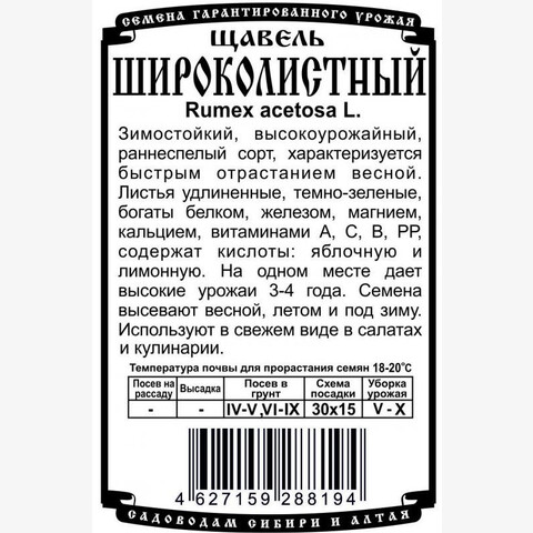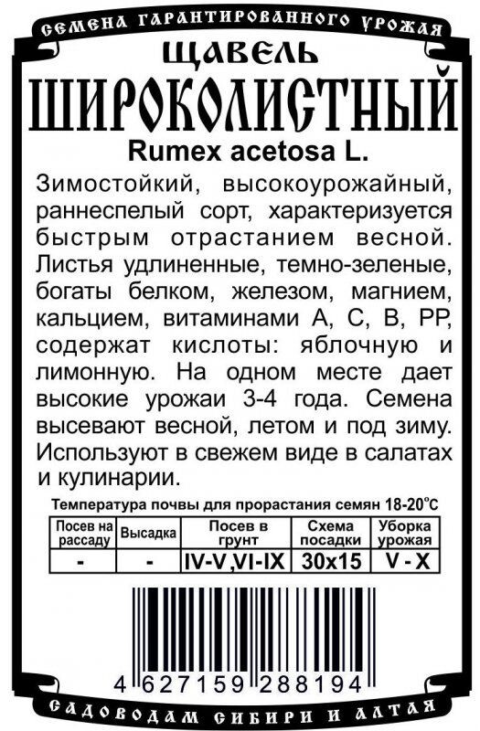 Зимостойкий, высокоурожайный, раннеспелый сорт, характеризуется быстрым отрастанием весной. Листья удлиненные, темно-зеленые, богаты белком, железом, магнием, кальцием, витаминами А, С, В, РР, содержат кислоты: яблочную и лимонную. На одном месте дает высокие урожаи 3-4 года. Семена высевают весной, летом и под зиму. Используют в свежем виде в салатах и кулинарии.