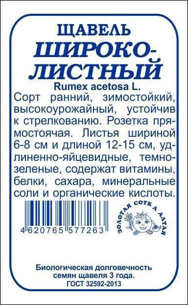 Сорт ранний, зимостойкий, высокоурожайный. Розетка прямостоячая, рыхлая. Листья удлиненно-яйцевидной формы, длиной 12-15 см и шириной 6-8 см, темно-зеленые. Щавель содержит комплекс витаминов, белки, сахара, минеральные соли и органические кислоты. Используется в свежем виде, для приготовления зеленых щей и начинок к пирогам, заготавливается впрок.