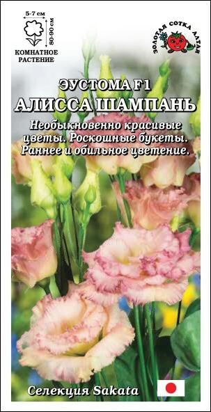 Раннецветущая гибридная эустома, роскошные цветы которой манят необыкновенно красивым сочетанием оттенков: кремовый, золотистый и припыленный сиренево-розовый. Стебли высокие, прочные, не гнутся и не ломаются под тяжестью огромного количества махровых цветов с волнистыми лепестками. Серия Алисса прекрасно развивается и обильно цветет в оранжереях и при сезонном выращивании в саду. Срезанные цветы долго стоят в вазе.
