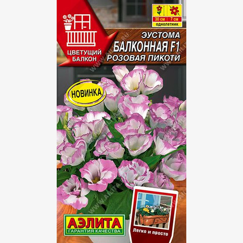 • Балконная эустома, с изумительными по красоте нежными цветками, в средней полосе чаще выращивается в качестве однолетника. Компактная, низкорослая, высотой 20-30 см, хорошо ветвится, не перерастает и не требует формирования. Цветение начинается со второй половины лета, когда распускаются крупные розовидные цветки диаметром 5-7 см. Эустома хорошо растет в горшках и балконных ящиках, прекрасно смотрится в садовых вазонах. Осенью у растений обрезают побеги на 2/3 длины и помещают в теплое и светлое помещение, где при создании оптимальных условий они зацветут повторно. Для выращивания одного растения требуется горшок диаметром 20 см.