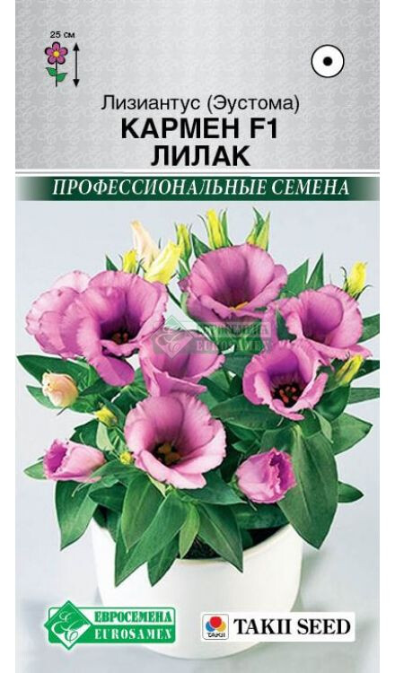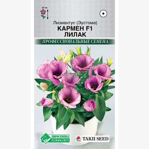Lisianthus (Eustoma) grandiflorum Karmen F1 Lilac Эустома (лизиантус) вновь настойчиво привлекает массу поклонников. Сочетая нежность цветов розы, силу пышных листьев и слегка капризный характер, она имеет множество названий и известна среди цветоводов также под именем японской розы и техасского колокольчика. Это представитель травянистых растений, что в переводе с греческого означает красивые уста! Описанная еще в ХVIII веке, эустома крупноцветковая в результате активной работы селекционеров дала начало разнообразным сортам. Эустома Кармен - специальная серия от японской компании Takii Seed для выращивания в горшках. Компактные, низкорослые и сильно ветвящиеся растения имеют крупный цветок. Цветки махровые, с несколькими рядами лепестков. Очень эффектное растение, как для сада, так и для дома, широко использующееся также для украшения различных мероприятий. Эустома- нежная дочь прерий в вашем саду или на окне!