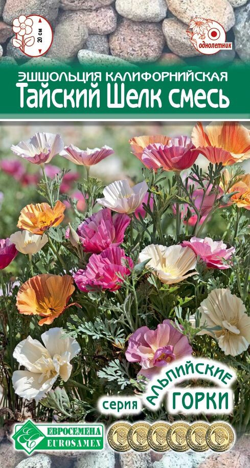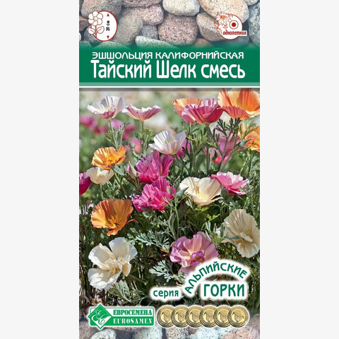Эшшольция — травянистое растение семейства Маковые, завезенное в нашу страну в середине 19 века из Калифорнии ботаником И. Ф. фон Эшшольцем, и получившее, соответственно, свое название в честь его имени. Ее называют еще калифорнийским маком за внешнюю схожесть цветов. В садоводстве пользуется популярностью за счёт своей неприхотливости и обильного, продолжительного цветения. В естественной среде занимает собой целые поля и луга. В России культивируется в однолетней культуре, хотя на Родине считается многолетней. Это обладательница сильно рассеченных листьев, богатой цветовой гаммы, причем как одного цвета, так и нескольких оттенков, махровых либо простых по форме цветков. Тайский Шелк - интересная смесь эшшольции с полумахровыми цветками самой разнообразной окраски, поражающей воображение. Флористы и дизайнеры выбирают ее за легкий, ажурный вид и яркость окраски. Используется широко для посадок в моноклумбах, в альпийских горках, для создания бордюров, а также в комплексном составе мавританского газона.