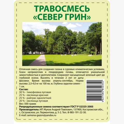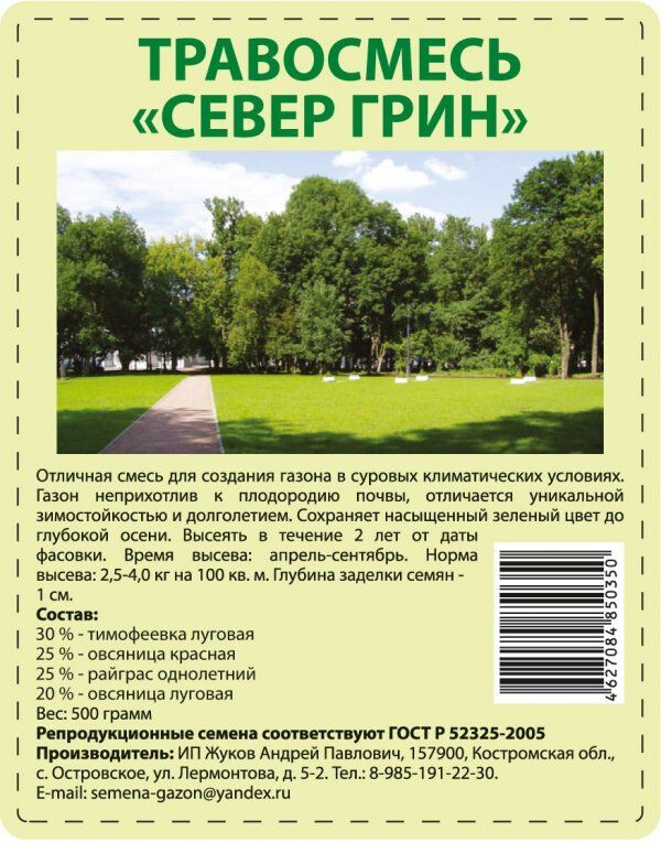 • Состав: 20% - Райграс однолетний, 30% - Тимофеевка луговая, 25% - Овсяница луговая, 25% - овсяница красная