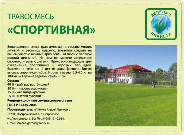 Качественная смесь для участков с высокой нагрузкой. Предназначена для спортивных и игровых площадок, стадионов. Образует низкорослый, плотный и устойчивый к истиранию газон, красивого темно-зеленого цвета. Обладает высокой устойчивостью к болезням. Состав: 40% - Райграс пастбищный, 30% - Тимофеевка луговая, 25% - Овсяница красная, 5% - Мятлик луговой