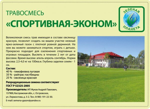 • Состав: 35% - Райграс пастбищный, 40% - Тимофеевка луговая, 25% - Овсяница красная
