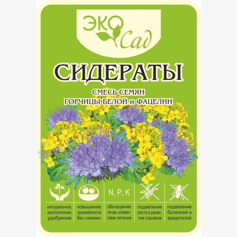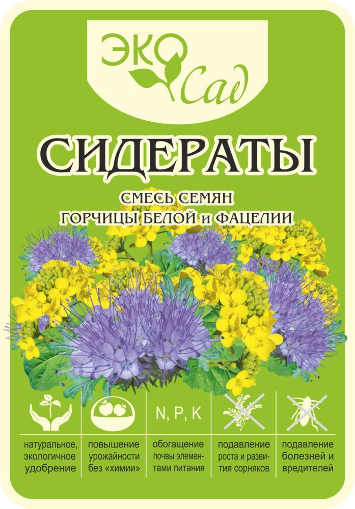 • Горчица и Фацелия подавляет развитие сорняков. Образует в процессе вегетации большую биомассу, которое после заделки становится легкоусвояемым удобрением для последующих культур, содержит в своем составе эфирные масла, что является природным средством от проволочника, слизняков, подавляет развитие гребных инфекций, то же время повышает численность почвенных микроорганизмов, что приводит к повышению плодородию земли. Является ценной медоносной культурой. Агротехника: можно высевать до 3-х раз за сезон – с апреля по сентябрь. Глубина заделки семян 1,5-2 см. Период от посева до заделки в почву 40-55 дней. Отросшую зеленую массу скашивают и заделывают в почву на глубину 8-15 см до начала бутонизации. Норма высева: 500 г на 100 кв.м.